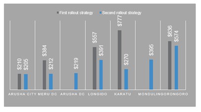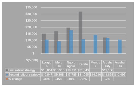 The most significant change between the second and third phases was the shift of leadership of the touches from the PATH implementation team to the mentors to establish a fully government-owned model. As unpublished data from the PATH costing work in 2015-2017 shows, the government-owned model reduced implementation costs, with a decrease between 10%-65% per district with the shift to the government-led strategy (Figure 2). At the health facility level, it is even clearer the difference in implementation costs, with significant reductions as seen in Figure 3 in the Arusha region districts.