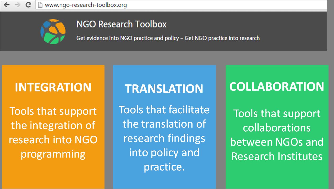 To reduce the feeling of constantly re-inventing the wheel, the study showed that it is important to have a set of supportive tools to save time and resources. Many tools are available, but they are scattered and therefore not easily accessible. As a first step, I developed a web-based platform called the NGO Research Toolbox, a collection of relevant tools for research in one place.