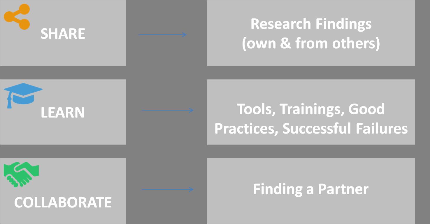 - To collaborate with others, to find partners (e.g., other NGOs, Research Institutes, etc.), to learn from existing partnerships.