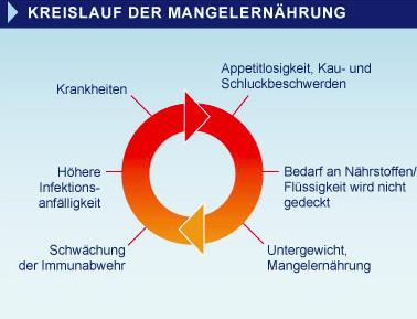 Ein Hauptfaktor für Mangelernährung im Alter ist neben veränderter Geschmacksempfindung, reduzierter Resorption im Magendarmkanal auch die Appetitlosigkeit als Folge von Erkrankungen oder Medikamenteneinnahme. Kau- und Schluckstörungen, körperliche Hilfsbedürftigkeit mit eingeschränkter Möglichkeit, selbständig zu kochen oder zu essen, können die Lust am Essen reduzieren. Ein dadurch resultierender Gewichtsverlust kann zum Verlust von Muskelmasse führen und weitere Einbußen der Selbständigkeit nach sich ziehen. Dies hat wiederum Einfluss auf den Appetit und die Fähigkeit, sich ausgewogenen zu ernähren. Hinzu kommen im Alter vermehrte soziale und psychische Herausforderungen wie Einsamkeit, Depression. Verwirrtheit oder Vergesslichkeit tragen dazu bei, dass regelmäßige Mahlzeiten und das Trinkverhalten beeinträchtigt sind. Häufig besteht eine unzureichende Nährstoffaufnahme. Sowohl einzelne Ursachen als auch das Zusammenwirken mehrerer Faktoren führen rasch zu einem schlechten Ernährungszustand mit spürbaren Auswirkungen auf die Gesundheit. Es entsteht ein Kreislauf der Mangelernährung.