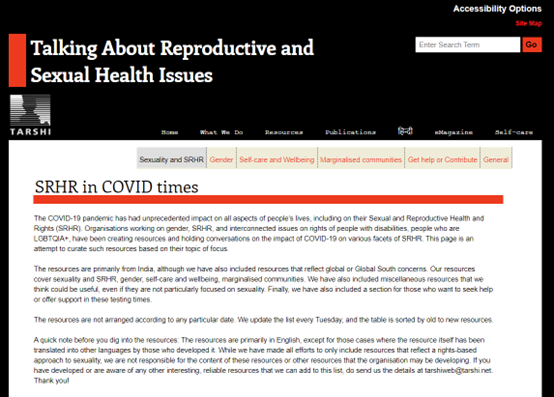 Web pages: Owing to the impact of the COVID-19 pandemic on all aspects of people’s lives, including on their sexual and reproductive health, we created a new online resource ‘SRHR in COVID Times’. The webpage is a compilation of resources that explore the interrelationship between COVID-19, SRHR and wellbeing primarily in India and largely in the Global South. Through the first wave of the pandemic, its aftermath, and later during the second wave, the resource has been updated regularly with fresh sources and perspectives on COVID-19 and SRHR.
