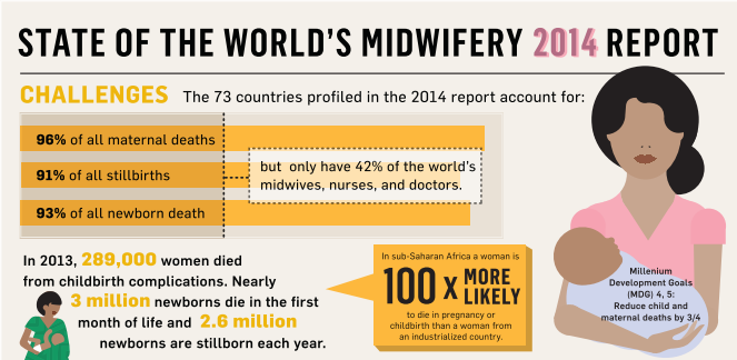 Il n'y a toujours pas assez de sages-femmes suffisamment formées pour assurer une qualité des soins. Ceci contribue à des centaines de milliers de décès tous les ans que l'on pourrait prévenir. Selon le rapport du « State of World’s Midwifery 2014 » (l'état de la pratique de sage-femme dans le monde), seulement 22% des 73 pays étudiés ont potentiellement assez de sages-femmes pour fournir des interventions capables de sauver des vies, pour répondre aux besoins des femmes et des nouveau-nés. Donc 78% des pays étudiés connaissent une pénurie grave de soins adéquats. Au fur et à mesure que la population augmente, plus les lacunes en ressources et infrastructures deviennent critiques à moins que des mesures urgentes ne soient prises.