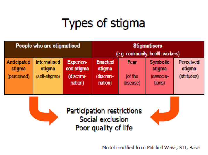 Different types of stigma are described by van Brakel, Weiss and other authors, distinguishing different processes from either the perspective of people who are stigmatised, or of the stigmatisers. Not only enacted and experienced, but also internalized stigma can lead to persons with disabilities restricting themselves from participation, social exclusion and hence a poorer quality of life.